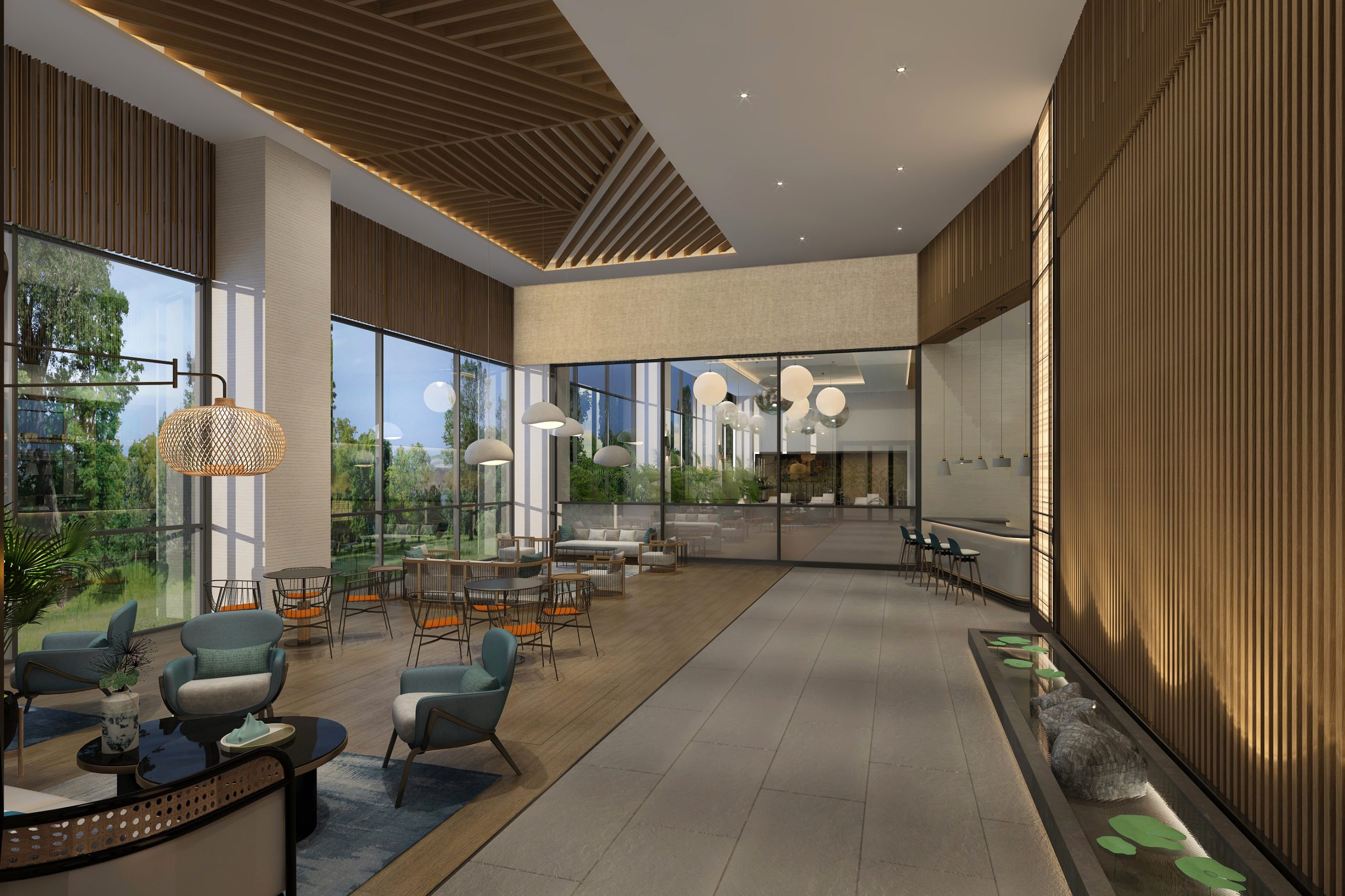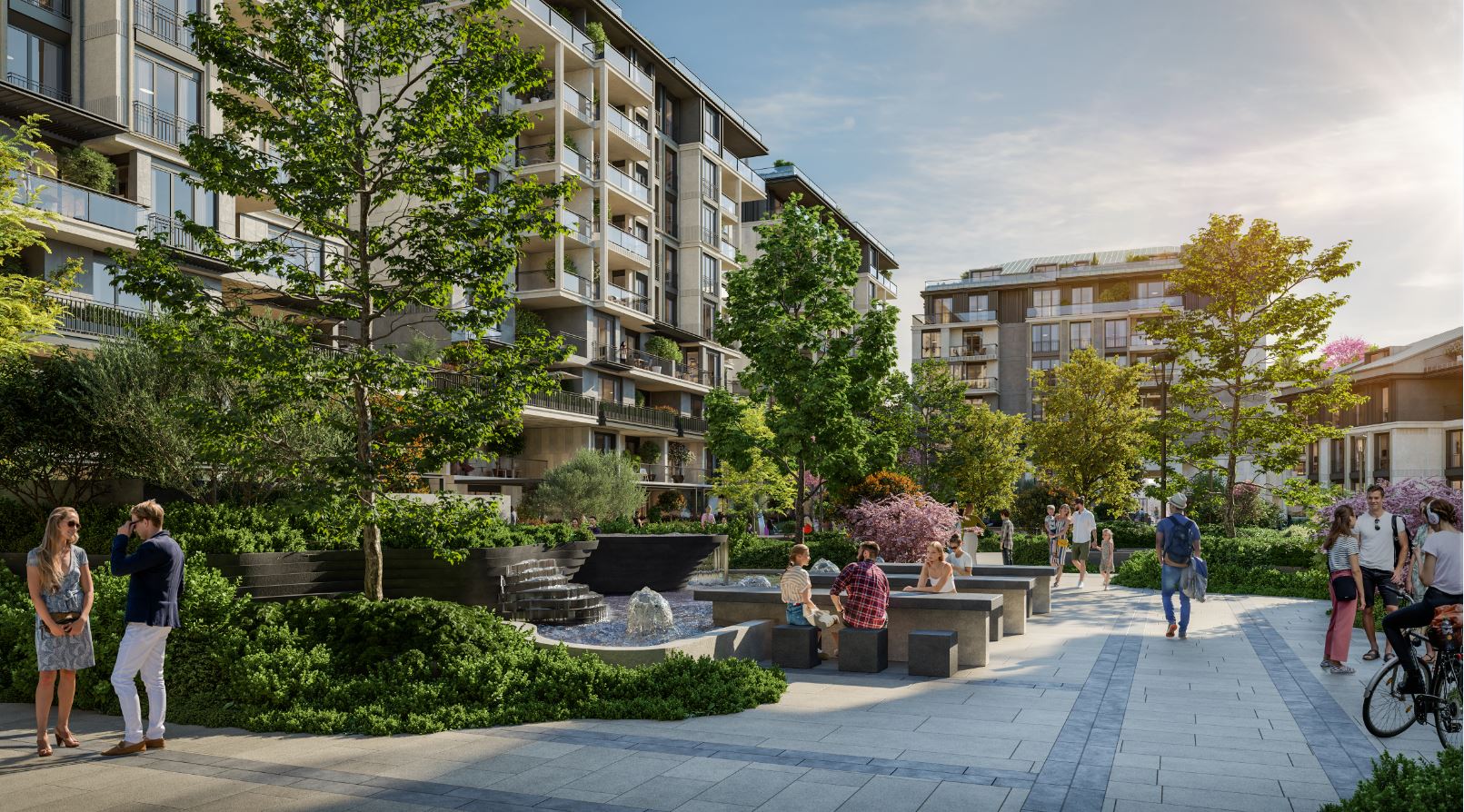 Gardens, cascading pools, walking paths, and activity areas