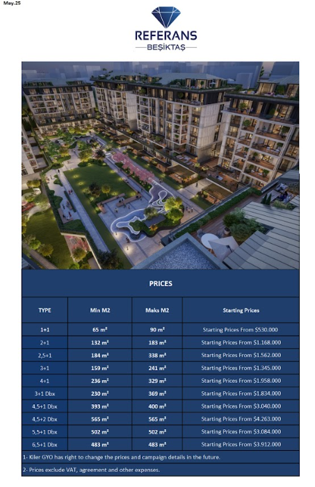 Referans Beşiktaş combines the perfect harmony of Istanbul’s historical texture and modern living, offering an exclusive lifestyle in the heart of Beşiktaş. Rising under the shade of 200-year-old trees with a unique Bosphorus view, the project is being realized with the experience of Kiler GYO. With its unique architecture and strategic location, the project aims to be both a legacy of today and the future, offering an elite living standard with a limited number of residences.